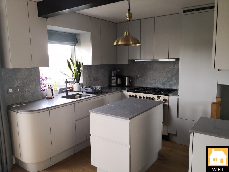 We were tasked with designing and building a bespoke kitchen to exploit all available storage space. Base units with pull-outs using Blum Tip-On Blumotion Legrabox. Westco Tradition Line Bins have Tip-On. Integrated fridge and wall units with Hettich WingLine L Push-to-Move bi-fold doors. Colour flow to the open plan living space was a requirement, a space we had previously decorated.
