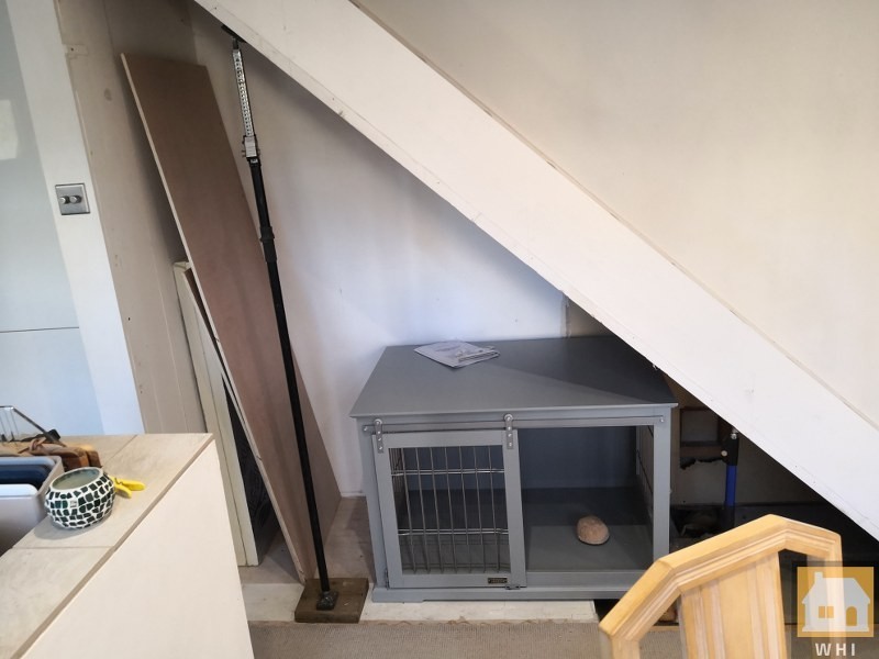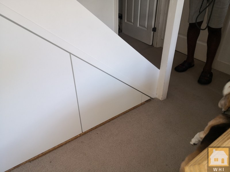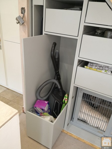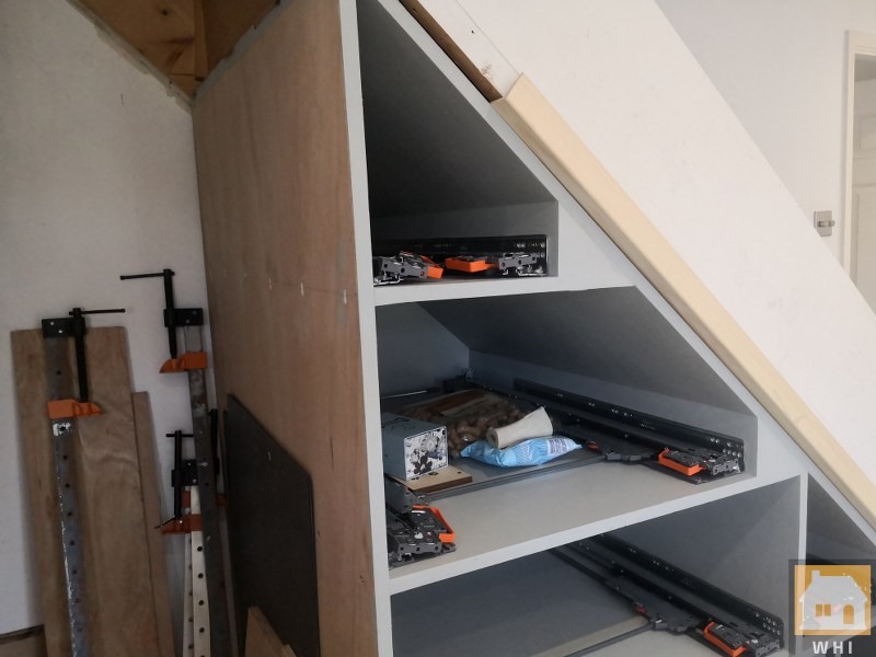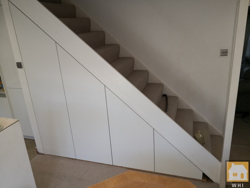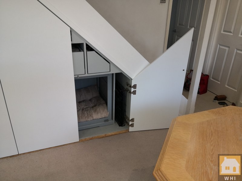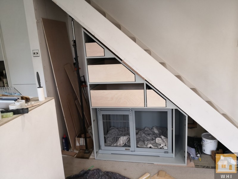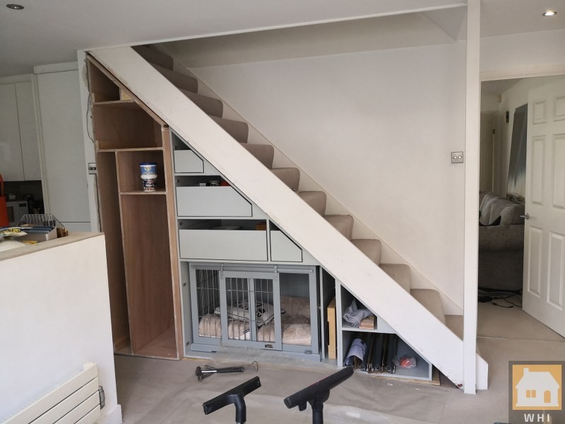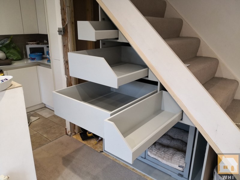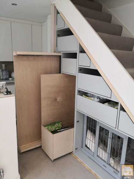 We designed, built and installed under stairs storage including a dog kennel with a wide angle door so the dog could see guests if put inside out-of-the way. An ironing board pull-out panel and vacuum cleaner bin were part of the remit. Birch ply constructed 650mm long drawers with dovetail corner joints using Blum Tip-On Blumotion runners carrying up to 60kg each.